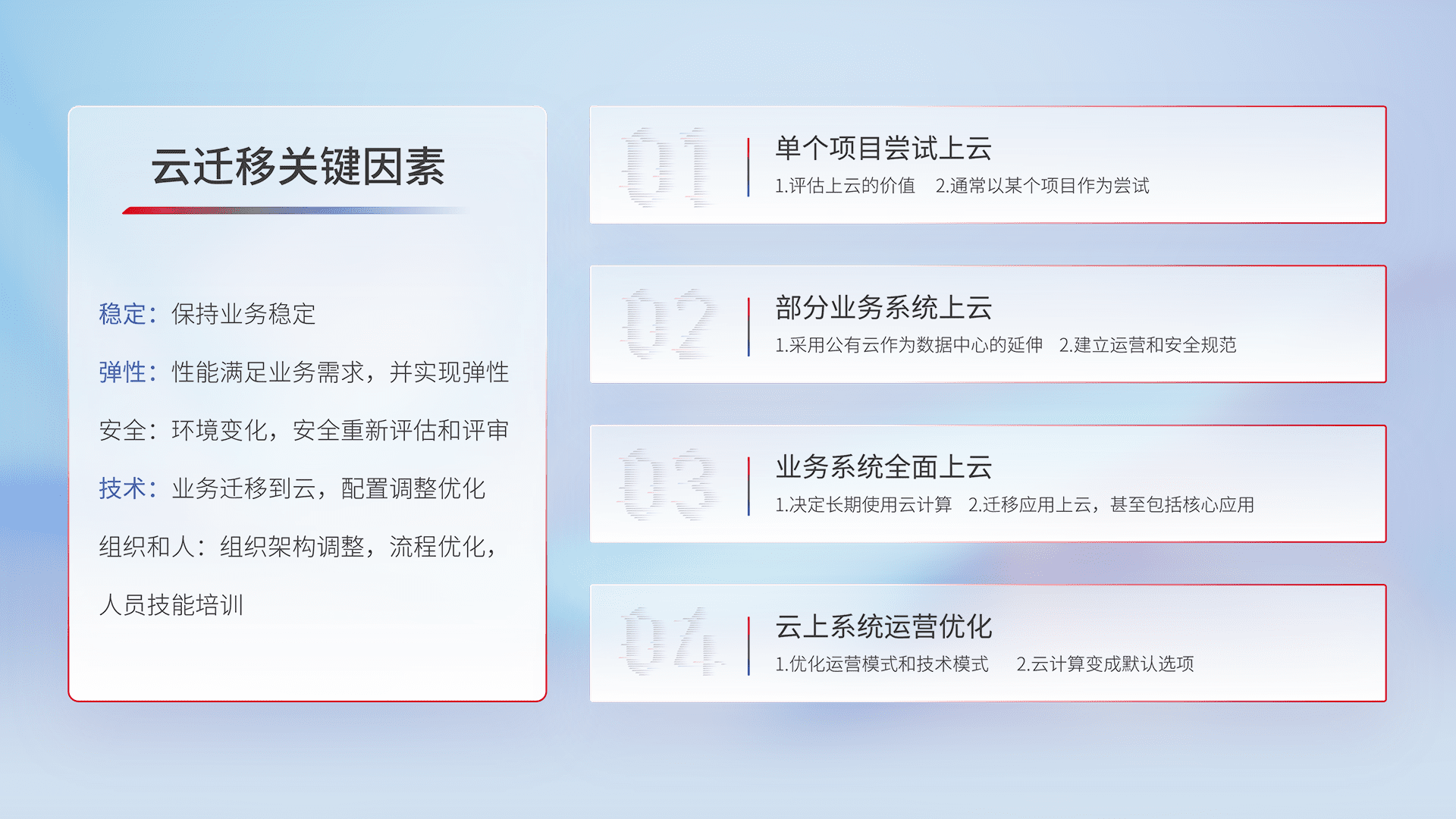结合实际业务,,,从规划设计、、云平台选型、、、云原生改造、、、数据迁移、、集成交付,,,迁移全过程为客户识别最佳上云路径,,做好风险识别管理,,设计网络架构、、、身份权限、、、安全审计合规、、操作审计、、、、日志审计、、、、监控告警策略、、、、多站点容灾设计等,,,,对云上基础设施进行整体规划,,提升IT治理水平,,,,以满足弹性、、、高可用、、、、高性能的需求。。。。