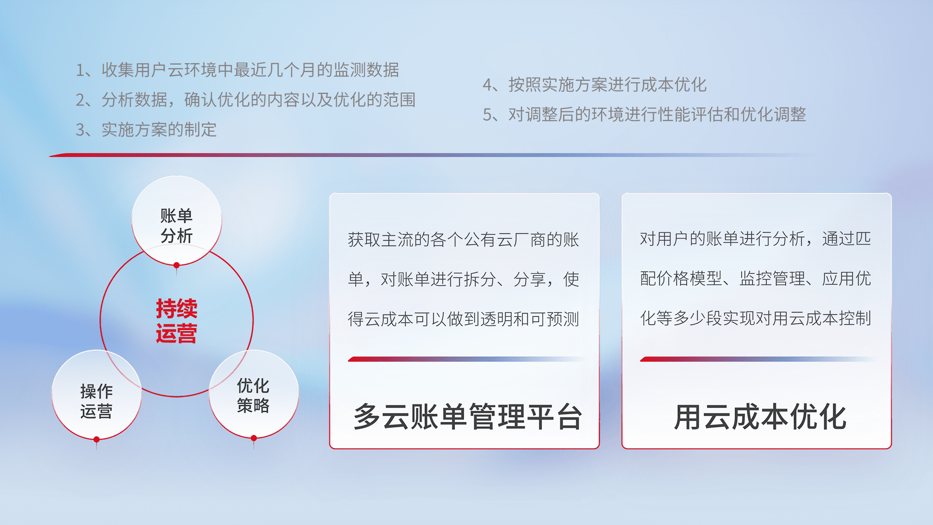 通过多云纳管,,以统一的资源数据模型把客户的云资源进行抽象和封装,,进而实现对多云资源的统一操作,,,保障云资源管理的可靠性、、稳定性与可用性。。。量身定制化运维内容,,配置、、、、开发运维、、补丁管理、、、备份、、、监控、、、认证和访问管理、、审计和日常巡检等,,保障在用云过程中的可靠度,,稳定度以及高可用率。。